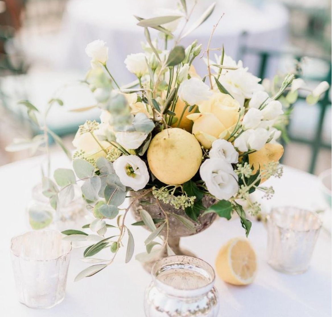 Kvety umiestnime do stredu stola do 1 nízkej vázy. Zelené listy umiestnime aj priamo na stôl pod vázu a medzi ne pôjdu citróny.